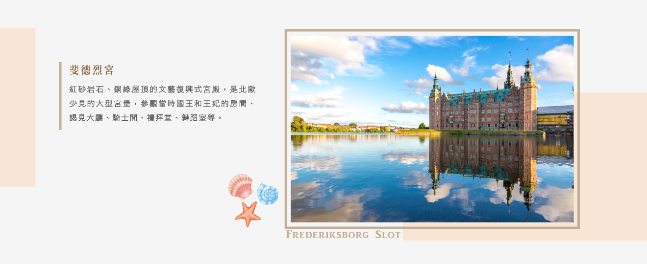 ★裴德烈宮(入內參觀),紅砂岩石、銅綠屋頂的文藝復興式宮殿,是北歐少見的大型宮堡,參觀當時國王和王妃的房間、謁見大廳、騎士間、禮拜堂、舞蹈室等,還可目睹當時的裝飾品和繪畫、王室悠閒的生活,其中以皇家禮拜堂最為精美,17~19世紀期間歷任的丹麥國王皆在此舉行加冕儀式,19世紀中期因大火而損毀,爾後以勸募方式而重建。
