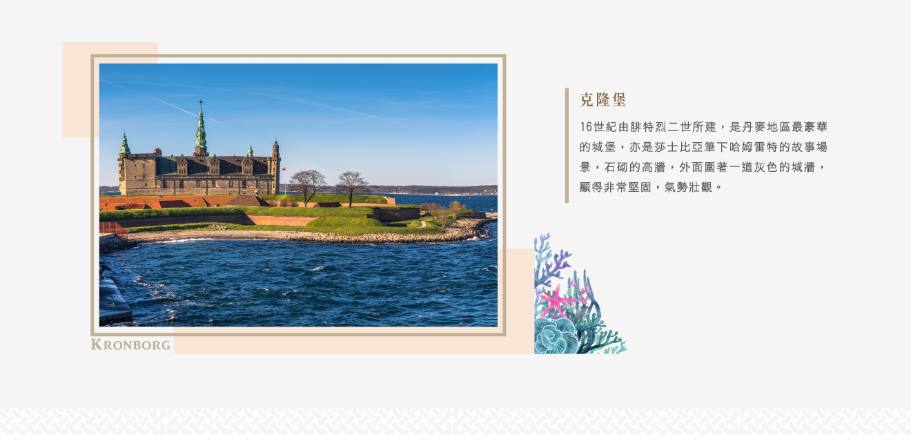 ★克隆堡(入內參觀),16世紀由腓特烈二世所建,是丹麥地區最豪華的城堡,亦是莎士比亞筆下哈姆雷特的故事場景,石砌的高牆,似乎是哈姆雷特父王鬼魂出沒之處,赫然在前的是一座白色的圓形高塔堡壘,外面圍著一道灰色的城牆,顯得非常堅固,氣勢壯觀。