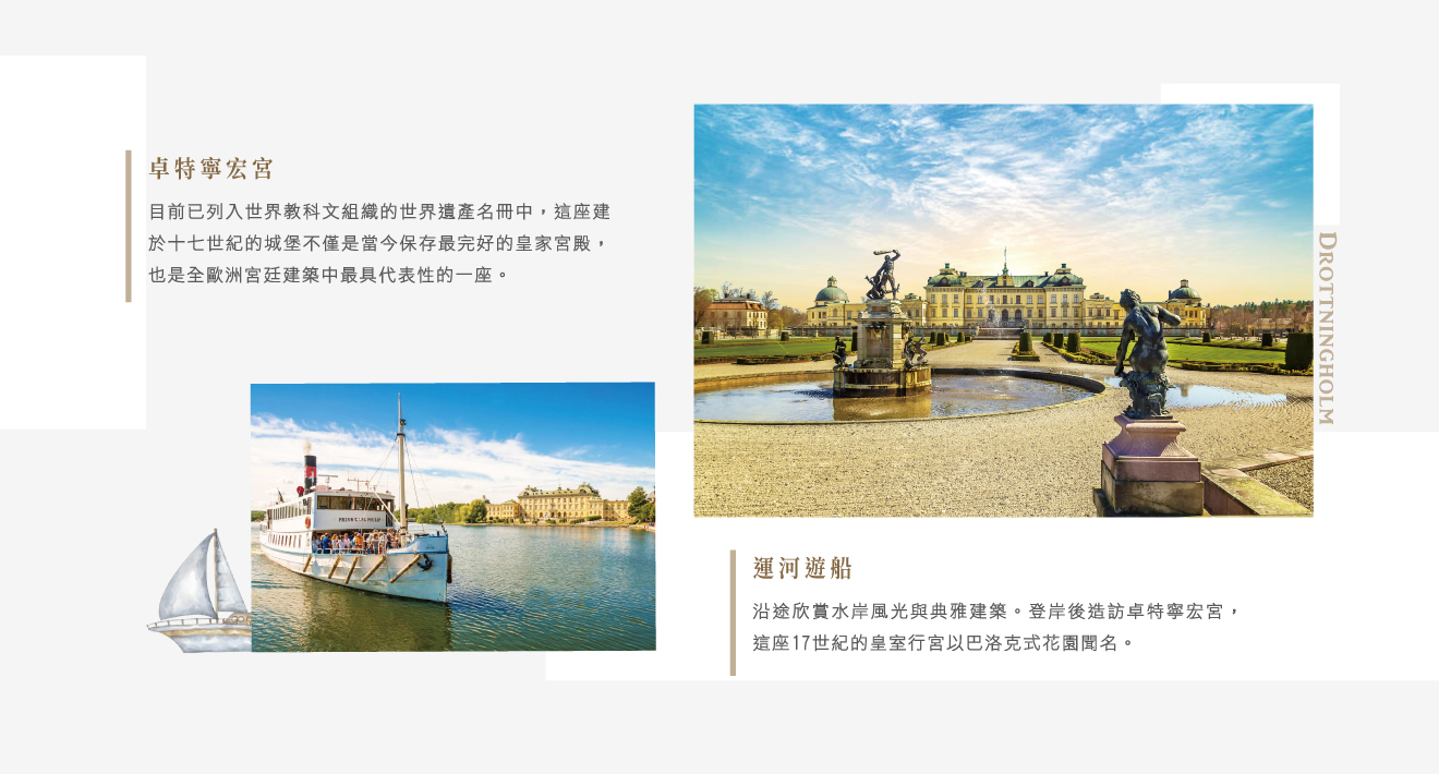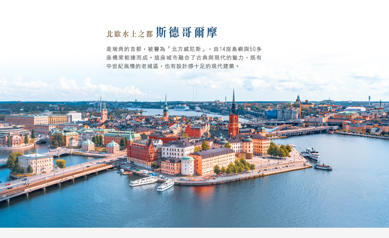住宿:At Six Hotel 或 Radisson Blu Collection Strand 或 斯德哥爾摩 Grand 或 Reisen in The Unbound Collection by Hyatt 或同等級