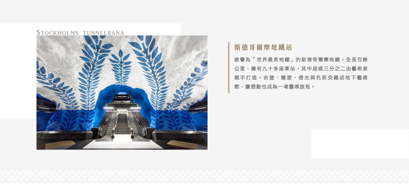 ◆造訪中央車站,斯德哥爾摩地鐵站長達110公里的地鐵系統被美稱為是世界最長的藝術走廊,也被各風格迥異的獨特藝術創作佔領,讓人乘坐地鐵時就像穿越另一個不同的時空,主要分做紅綠藍三線,在100個地鐵站中就將近九成的車站有如藝術展館一般,陳設不同藝術家的作品,從50年代的藝術風格一直到現代實驗性藝術都一覽無遺〫