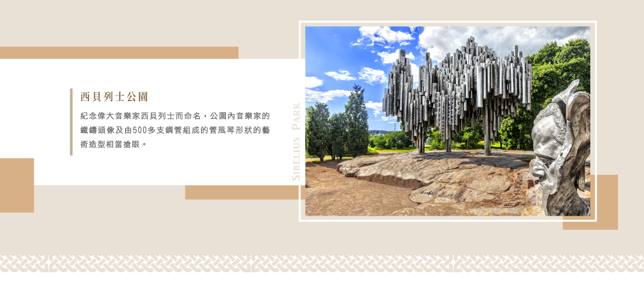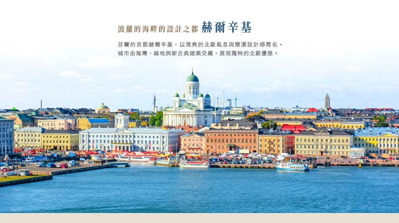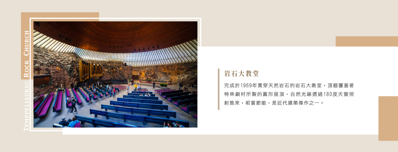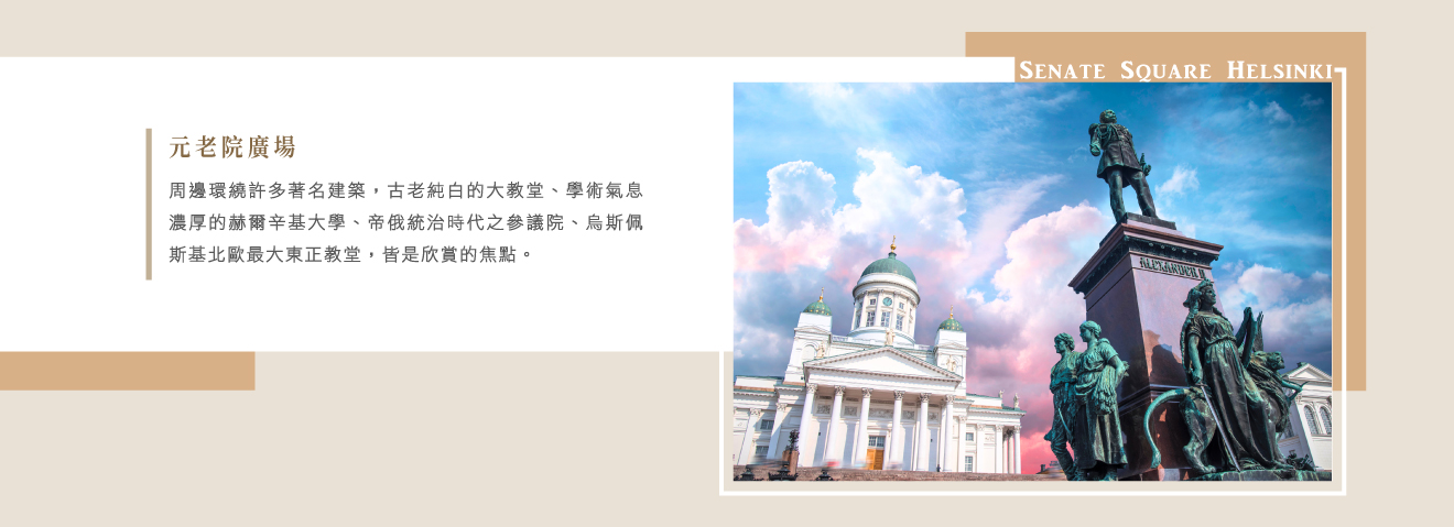 波羅的海之少女美譽的■赫爾辛基,這裏巧妙運用自然環境所完成都市的建築,最引人注目的是深受俄羅斯文化所影響的古建築,展開市區觀光■元老院廣場,周邊環繞許多著名建築,古老純白的大教堂、學術氣息濃厚的赫爾辛基大學、帝俄統治時代之參議院、烏斯佩斯基北歐最大東正教堂,皆是欣賞的焦點;續前往參觀完成於1969年貫穿天然岩石的★岩石大教堂,頂棚覆蓋著特殊銅材所製的圓形屋頂,自然光線透過180度天窗照射進來,相當節能,是近代建築傑作之一;■西貝列士公園,紀念偉大音樂家西貝列士而命名,公園內音樂家的鐵鑄頭像及由500多支鋼管組成的管風琴形狀的藝術造型相當搶眼。