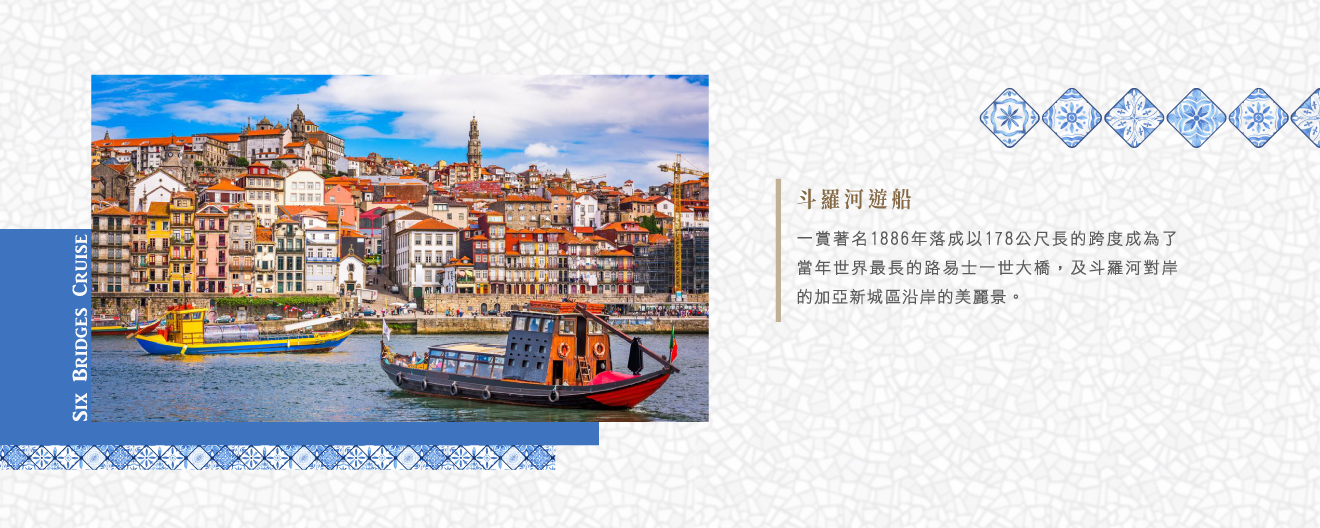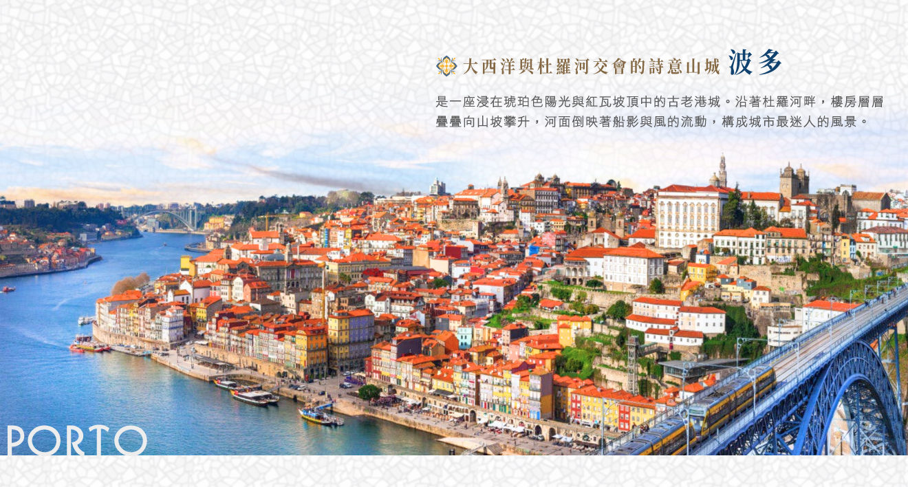 ■斗羅河谷葡萄酒揚名全世界,河谷二旁險峻斜坡梯田間的百年葡萄田添加它的優美,斗羅的意思是「金」,這裡的河流像一條長長的黃金,迂迴於狹窄山谷裏,鄉村景致美的令人屏息,特別在季節陽光的照射下,大地一片如金色彩,更叫人流連忘返;斗羅河從西班牙延伸至波多而入大西洋,但只有在上游段的葡萄田是最上等的釀酒原料,此區域也被視為最有價值的土地,特別安排◆頂級葡萄莊園品酒。