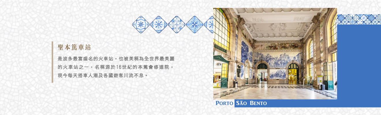 ■聖本篤車站是波多最富盛名的火車站,也被美稱為全世界最美麗的火車站之一,由本地建築師何塞·馬克斯·達席爾瓦設計,1916年啟用,名稱源於16世紀的本篤會修道院,現今每天搭車人潮及各國遊客川流不息,車站大廳以展現葡萄牙歷史人文生活的2萬幅藍瓷磚畫著稱。