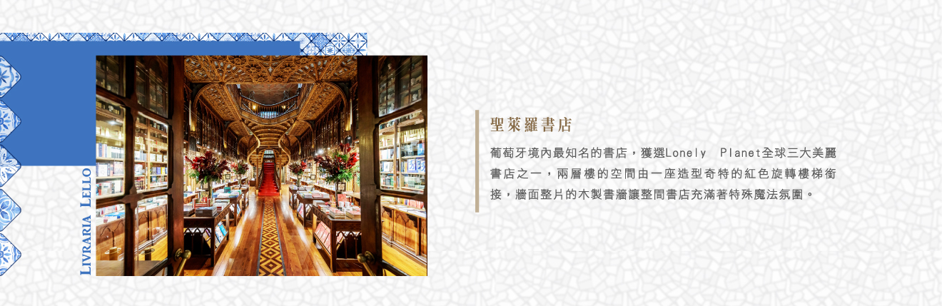 ★萊羅書店,葡萄牙境內最知名的書店,獲選 Lonely Planet全球三大美麗書店之一,是1906年建築師 Xavier Esteves所設計的新哥德式建築造型,兩層樓的空間由一座造型奇特的紅色旋轉樓梯銜接,牆面整片的木製書牆讓整間書店充滿著特殊魔法氛圍,2樓的彩繪玻璃牆上刻著書店座右銘decus in labore (英文為there is honor in work),據稱造型奇幻的萊羅書店間接建構了JK羅琳在哈利波特書本部份的魔法世界呢!