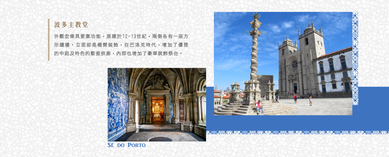 ★波多主教堂,位於可以看見市區的Terreiro da Se山丘上,外觀宏偉具要塞功能,原建於12~13世紀,復於17世紀改建為後期所見的樣貌,兩側各有一座方形鐘樓,立面卻是極簡裝飾,在建築上算是相當另類,但在巴洛克時代,增加了優雅的中庭及特色的藍瓷拱廊,內部也增加了豪華裝飾祭台。