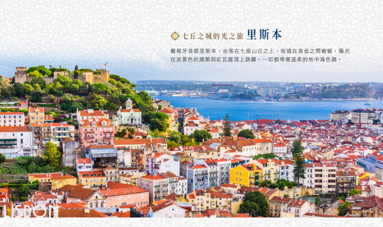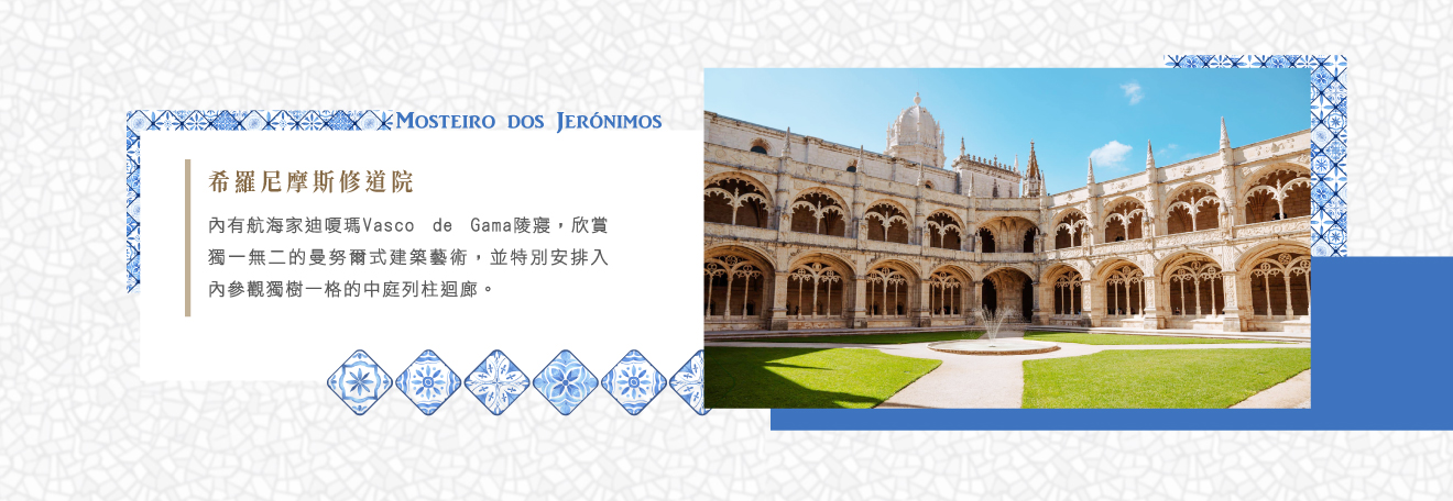 列入世界遺產★希羅尼摩斯修道院,內有航海家迪嗄瑪Vasco de Gama陵寢,欣賞獨一無二的曼努爾式建築藝術,並特別安排入內參觀獨樹一格的★中庭列柱迴廊,細節中隱約呈現的航海風格透露出大航海時代葡萄牙所擁有的權力與財富;隨後我們將去百年老店品嚐曾掀起熱潮的道地◆葡式蛋塔Pastel de Nata及品杯濃濃咖啡。