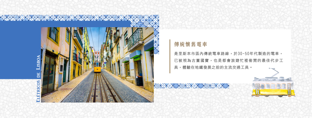 特別搭乘◆傳統懷舊電車,是里斯本市區內傳統電車路線,於30~50年代製造的電車,已被視為古董國寶,也是都會旅遊忙裡偷閒的最佳代步工具,我們特別搭乘一段極具人文景象、青年文化及夜生活的舊城區路線,體驗在地鐵發展之前的主流交通工具。