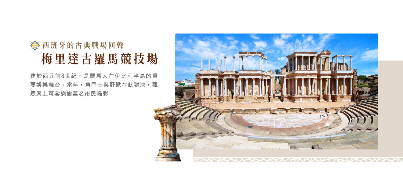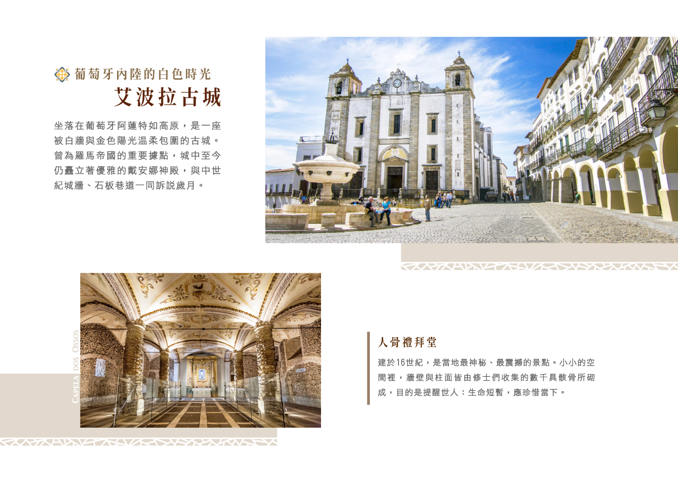 別具鄉村風情的阿蓮特如省■艾波拉古城,羅馬時期建城,之後被西哥特人、阿拉伯人及西班牙人佔領,十六世紀時,此城更以其貴族及大學生的活動,成為南葡萄牙的文藝復興重鎮,古城內的戴安娜神殿是敬仰歷代帝王的地方,其後也曾成為刑場,參觀世界上難得一見,以五千具人骨作為穹窿頂裝飾的★人骨禮拜堂,嚐試體會天主教的黑色幽默及人類另一種面對死亡的方式;續悠遊於大教堂廣場及幽靜的巷弄間,阿蓮特如獨有的湛藍天空搭配著舊城區的白色建築,宛若穿越時光回到了中世紀風情。午後越過邊境,進入西班牙境內,前往素有小羅馬之稱的■梅里達,古羅馬帝國時期成為富庶之都,今亦成為通往葡萄牙之要道,在瓜地安那河畔同時欣賞兩千年前壯麗不朽的羅馬古橋及現代建築師Santiago Calatrava設計的前衛鋼纜吊橋;古城內羅馬時期的黛安娜神殿及★古羅馬競技場及半圓露天劇場,經歷了風霜依然矗立、充滿殖民地風格的西班牙廣場更娓娓道出那段開發新大陸的歷史!