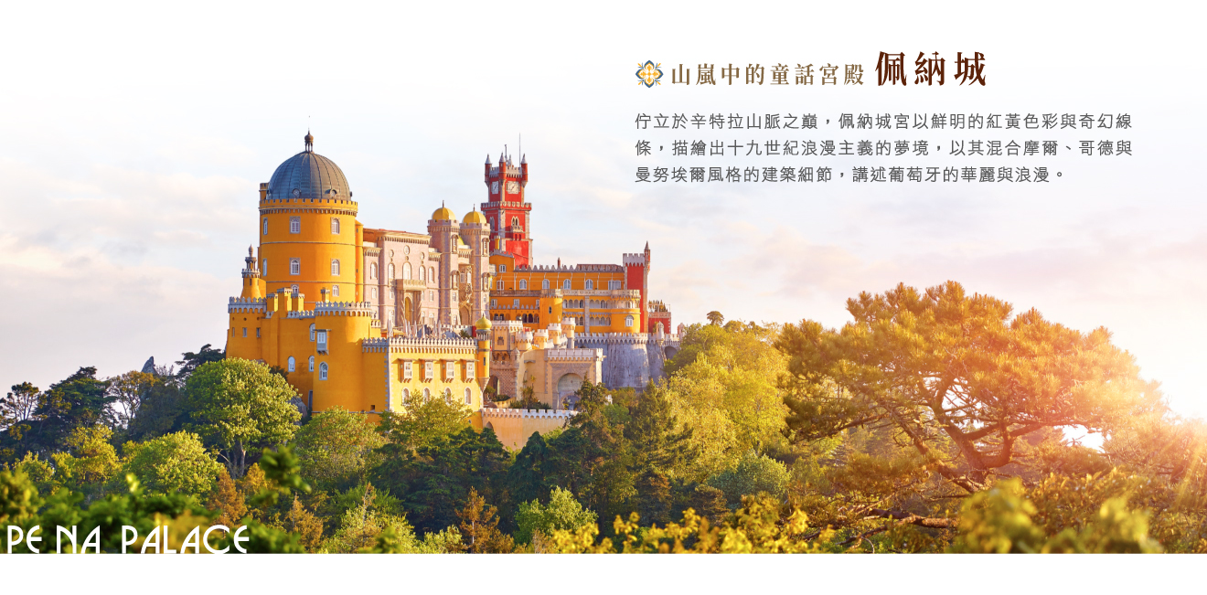 ■辛特拉,位於丘陵起伏、森林環繞的美麗山中小鎮,1995年列名世界文化遺產,英國詩人拜倫曾盛讚這裏為天堂樂園入口;★佩納城,位於海拔500公尺處,是一座如童話般的城堡,19世紀國王斐迪南二世聘請德國建築師艾斯威吉興建這座城堡,綜合歐洲各時期建築風格、葡萄牙本土風格及色彩繽紛而聞名,如伊斯蘭清真寺的尖塔、哥德式塔頂、文藝復興式屋頂、曼努爾式窗戶……,內部的小禮拜堂、阿梅利亞女王室、土耳其人的沙龍等華麗廳堂,表現王室的盛世光榮、也完整保留當時的樣貌。