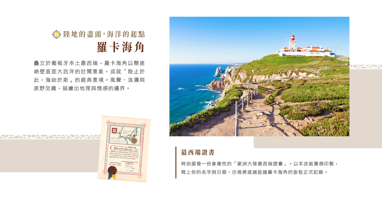 詩人Luis de Camoes 句中的“Aqui onde a terra se acaba e o mar comeca”「大地盡頭,海之開端」歐洲最西端的盡頭■羅卡海角,這裏豎立一座紅色燈塔,可看到壯闊無比的海洋及險峻的懸崖景觀,隨後頒發歐洲大陸到達★最西端證書!