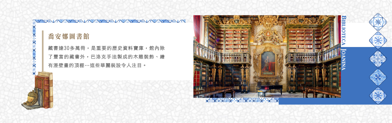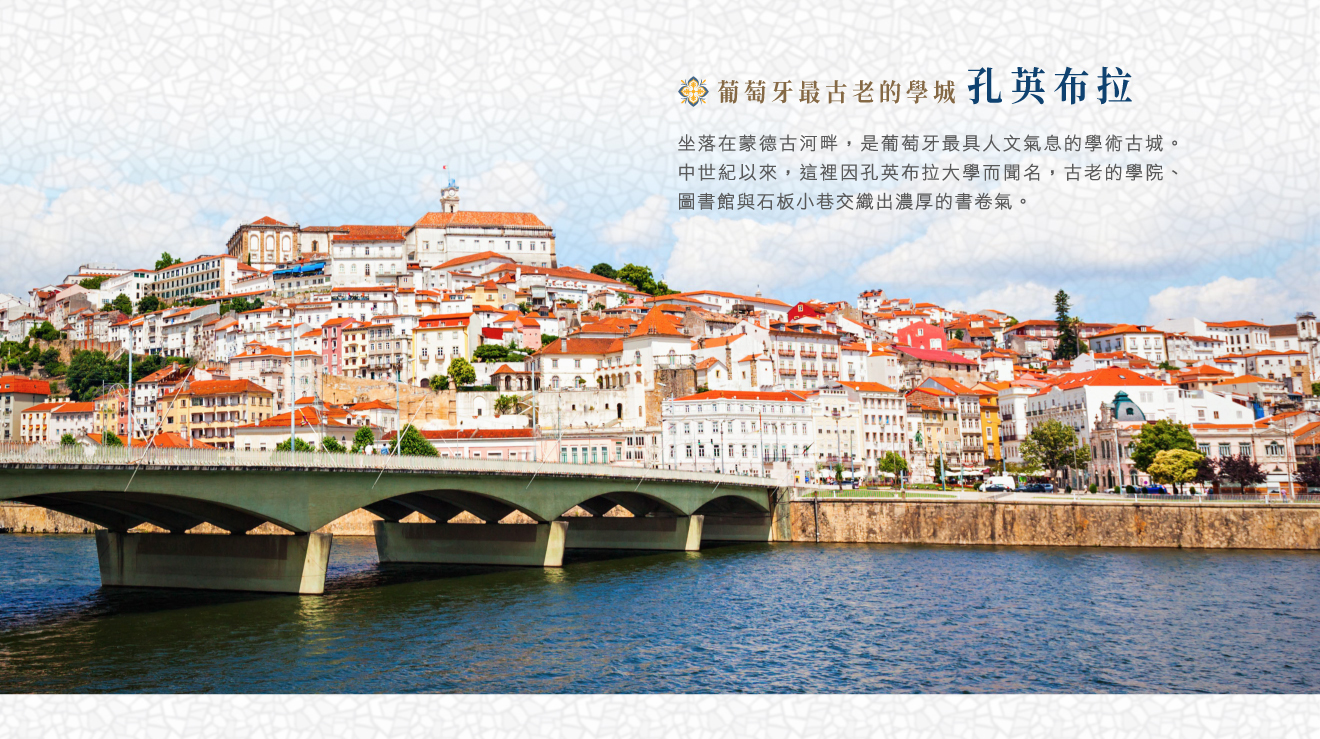 ■孔英布拉,位於葡萄牙中部蒙德古河畔,是葡萄牙古都也是葡國第三大城,僅次於首都里斯本與港市波多,在11~13世紀時曾經做為王國的首都,1290年科英拉布大學由波尼士一世創立,是全葡最古老也最著名的大學,培育出許多傑出人士,日後成為葡萄牙各行各業的菁英份子;位於山丘頂的大學城區內的各式古老建築質樸寧靜,沒有觀光地的絢麗繁華,最適合漫步期間;★喬安娜圖書館,藏書達30多萬冊,是重要的歷史資料寶庫,館內除了豐富的藏書外,巴洛克手法製成的木雕裝飾、繪有溼壁畫的頂棚…這些華麗裝設令人注目,也全拜巴西殖民帶來大量的財富所賜〫