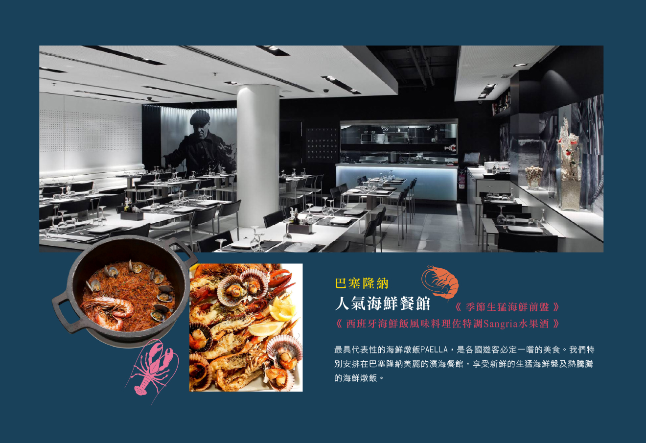 晚餐:特別安排季節生猛海鮮餐、西班牙海鮮飯風味料理佐特調Sangria水果酒