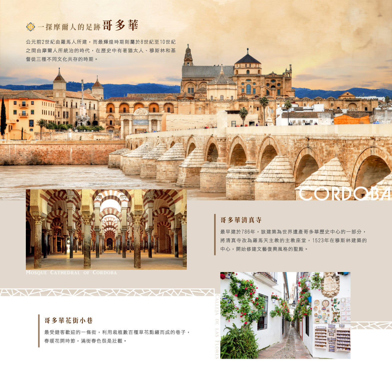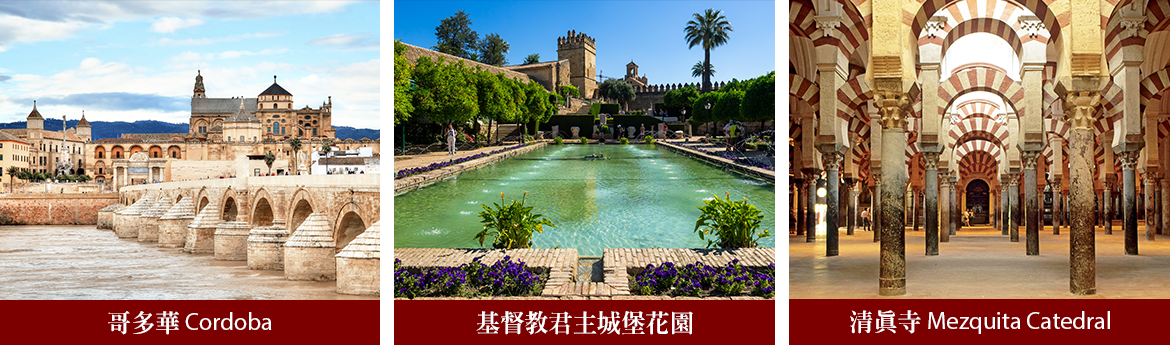 此一時期所留下的★清真寺更是回教遺留在安達魯西亞最珍貴的瑰寶之ㄧ,由當地具執照專業導遊帶領下入內參觀,帶您認識伊斯蘭宗教思想的建築風格與內部裝飾:大拱頂、馬蹄拱門、交錯廊柱、幾何雕花、及阿拉伯文書法。基督教光復後在清真寺內改建的大教堂,也反映出改朝換代之間,回教與基督教勢力的消長。隨後悠閒地漫步在古城中探訪■花之街、猶太人區。