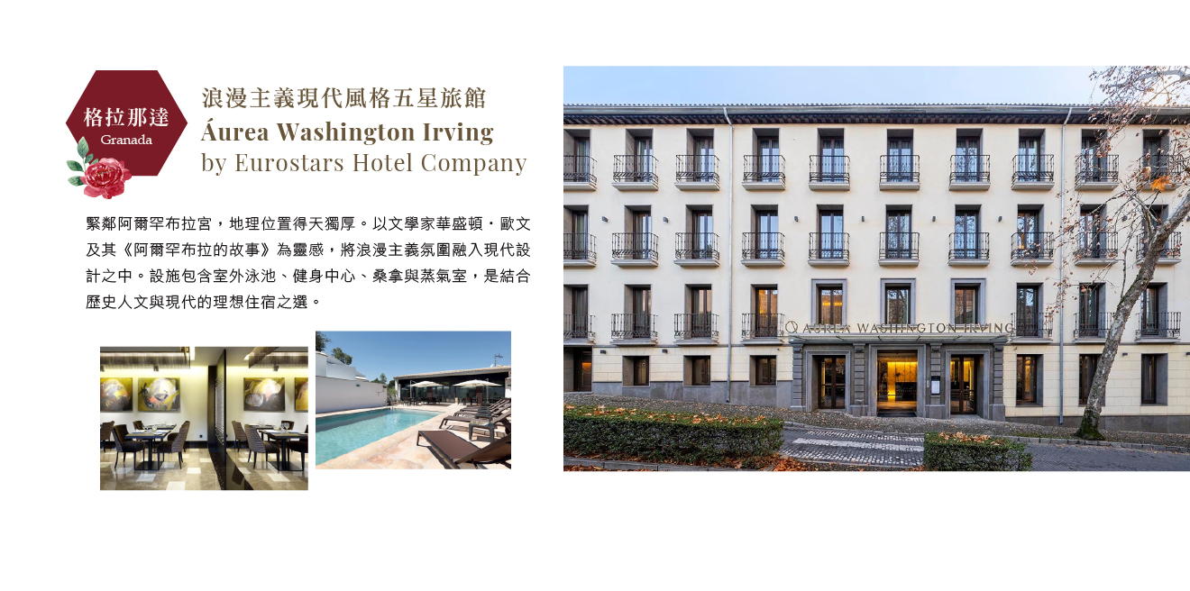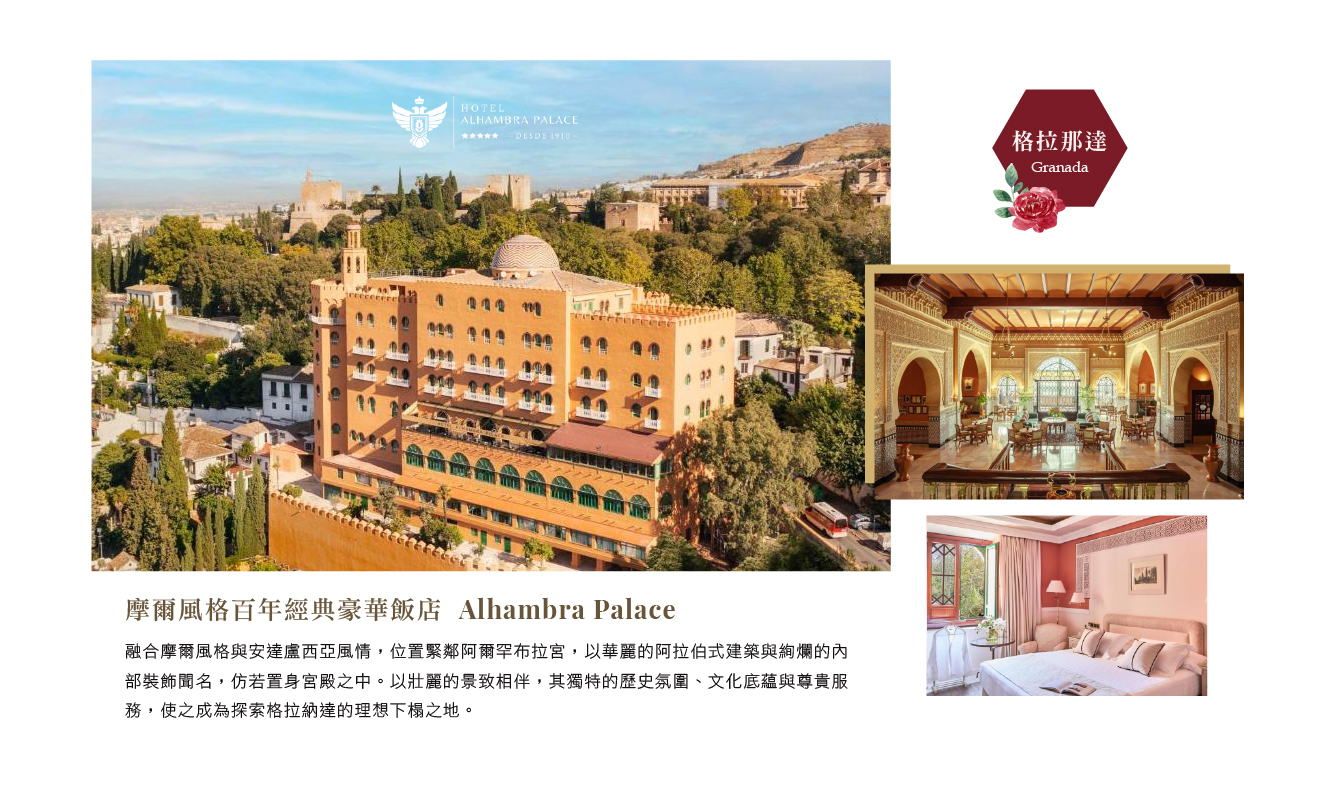 住宿:Eurostars Washington Irving 或 Palacio de Santa Paula Autograph Collection 或 格拉那達 Alhambra Palace 或同等級