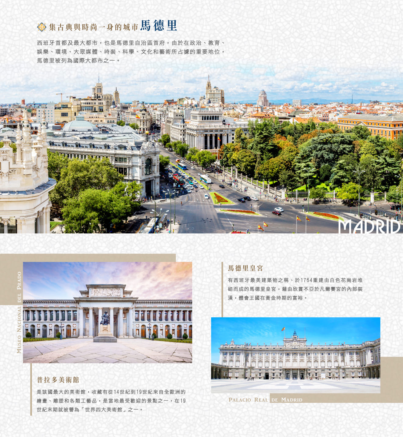 ■馬德里,由當地具執照專業導遊帶領下,引導參觀與法國羅浮宮、大英博物館齊名、收藏繪畫數量頗多也是古典藝術品齊聚的★普拉多美術館,窺探西班牙在12~18世紀間的藝術傑出表現,如埃爾葛雷柯、委拉斯奎茲、哥雅及部分塞維亞畫派大師作品。
