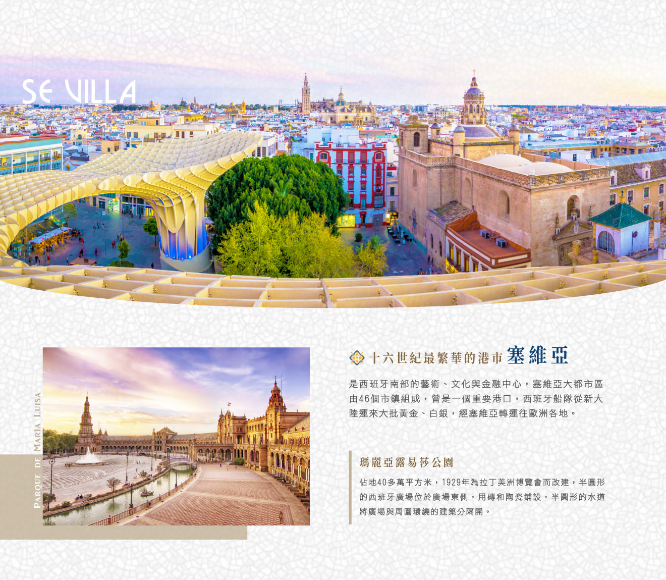 ■塞維亞,往1929年泛美博覽會址■瑪麗亞露易莎公園,造訪代表各國的建築及西班牙廣場、民俗廣場,認識西班牙人在500年前藉由殖民擴張即建立的世界觀。隨後徒步至古色古香、充滿伊斯蘭風味小街巷弄的■聖十字區、阿卡乍堡及★大教堂,並依個人體能登〝喜拉達塔〞,居高欣賞古城多樣的風情。隨後參觀2011年完成的新地標■都市陽傘觀景台Metropol Parasol,號稱世界最大的木建築,外形相當奇特,近似一朵朵的大香菇,由6個陽傘結構組合而成,德國著名建築大師Jürgen Mayer-Hermann所設計,其靈感是來自附近的塞維亞大教堂和無花果樹,2005年施工耗時7年完成,總工程款將近億萬歐元,都市陽傘共有四層,地下為Antiquarium,展出在此發現的古羅馬和摩爾遺址,一樓為中央市場,二樓和三樓為全景露台和餐廳,可供賞市中心景色。