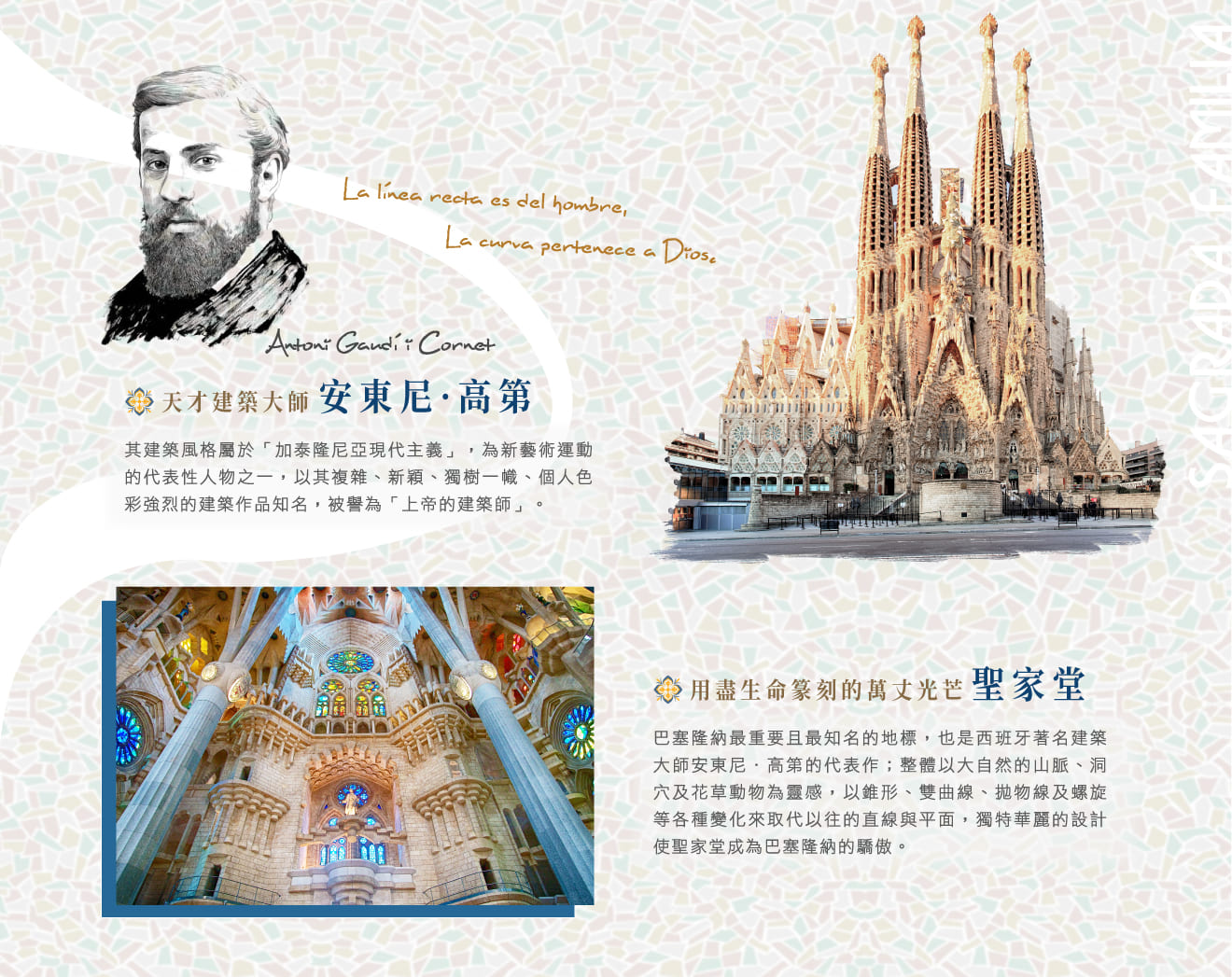 (1) 巴塞隆納市區高迪建築作品頗多,如有米拉之家、巴特尤之家、維森斯之家、奎爾宮……;不以景點多為勝,也考量團員的整日的體力狀況,保留時間彈性,如對建築感興趣者,可利用下午自由時刻自行前往。