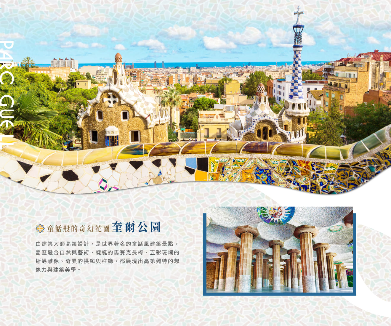 ■巴塞隆納,專業有當地執照的導遊帶領下,參觀★高第建築藝術~聖家堂+奎爾公園,前者為百年計劃的偉大宗教建築,是高第一生的職志,融合其個人自然主義風格,迥異於傳統教堂建築;後者為西班牙首創整體社區的規劃,高第巧妙地融合人文於自然之中,可以窺看高第迥異正統建築風格作品,一賞大師在建築觀念、技術和材料等超人一等的創意。