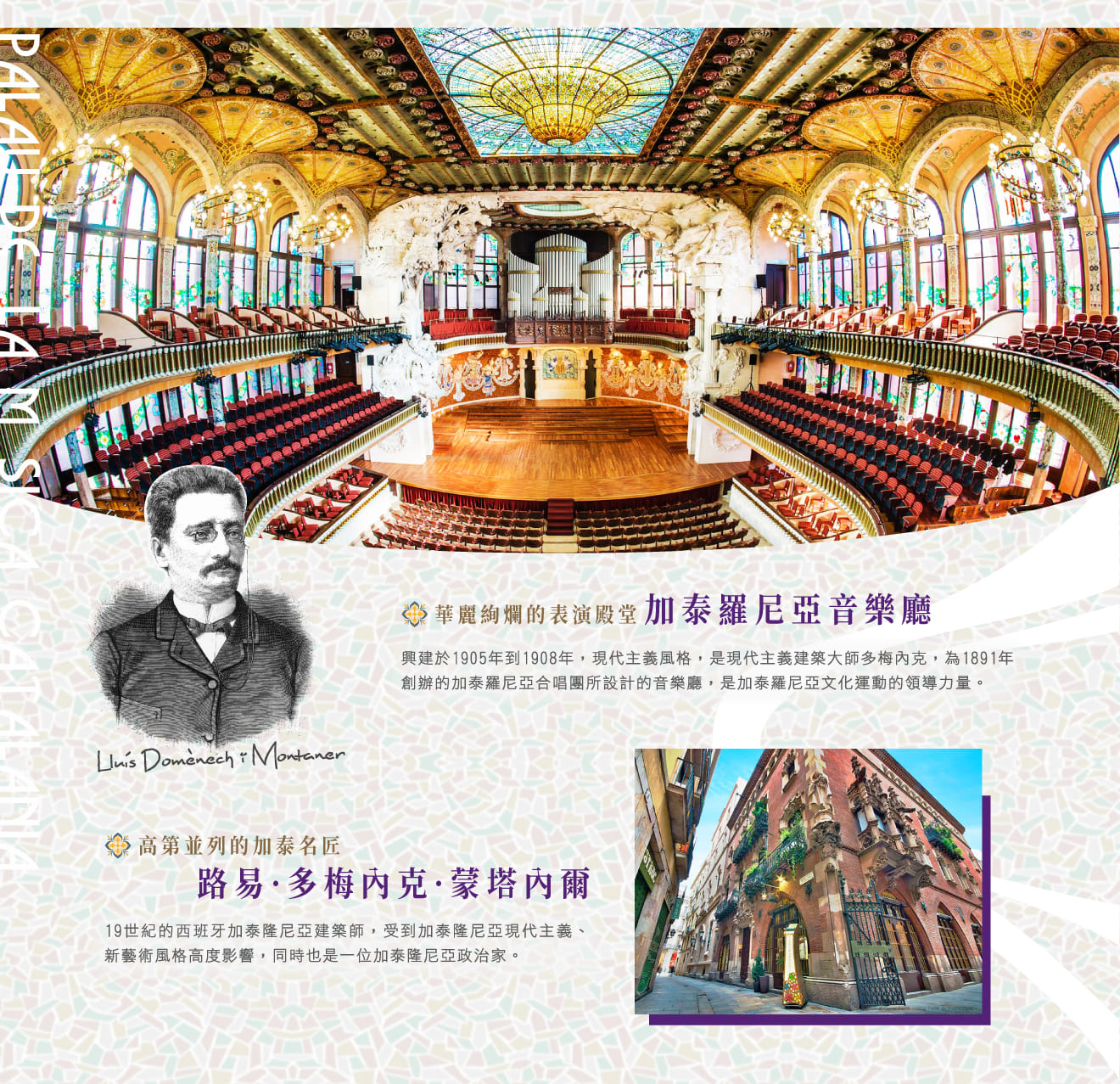 ■巴塞隆納,專業有當地執照的導遊帶領下,參觀★加泰隆尼亞音樂廳,興建於1905年到1908年,現代主義風格,是現代主義建築大師多梅內克,為1891年創辦的加泰羅尼亞合唱團所設計的音樂廳,是加泰羅尼亞文化運動的領導力量,坐落在狹窄的街道內,立面裝飾豐富,而且結合了華麗、色彩鮮艷多種元素,包括傳統的加泰羅尼亞和阿拉伯元素,這裡成為巴塞隆納最熱門的景點之一,白天可供遊客參觀內部,而晚上則可欣賞歌劇、古典音樂、傳統加泰隆尼亞樂曲和當代表演都在這裡上演。