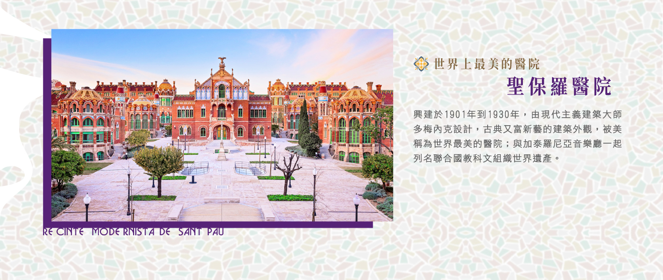 ★聖保羅醫院(加泰隆尼亞語Hospital de la Santa Creu i Sant Pau),興建於1901年到1930年,是成功的銀行家保羅希爾(Pau Gil),將一半遺產捐贈為蓋醫院之用,由現代主義建築大師多梅內克設計,古典又富新藝的建築外觀,被美稱為世界最美的醫院;與加泰羅尼亞音樂宮一起列名聯合國教科文組織世界遺產,直到2009年6月這裡一直作為醫院使用,目前正在改為博物館和文化中心。