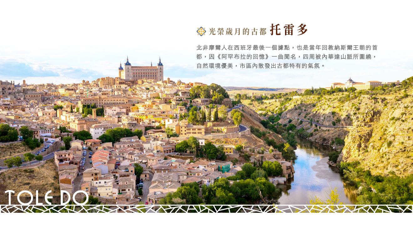 ■托雷多,Tajo河切割出的河谷三面環繞著山丘上的古城托雷多,絕佳的地勢自羅馬時期已經是重要的據點,其後的西哥德人、回教徒、基督教徒更是相繼在此設立首都,直到1563年首都遷至馬德里,也因此完整的保留千年來古城的原始風貌,於1986年整個古城區被列為聯合國認定的世界文化遺產;由當地具執照專業導遊帶領下引導參觀:★聖托美教堂,欣賞葛雷柯(El Greco)的名畫《歐爾嘉斯公爵葬禮》,淺嚐西班牙獨特的藝術傳統,隨後漫遊古色古香的小城街巷、大教堂廣場(與塞維亞教堂同為哥德式教堂風格,雷同度過高不特別入內,如對宗教聖器展覽及葛雷柯相關畫作有興趣可另行購票入內),感受典型中世紀古城風情,並可選購各種當地手工藝品。