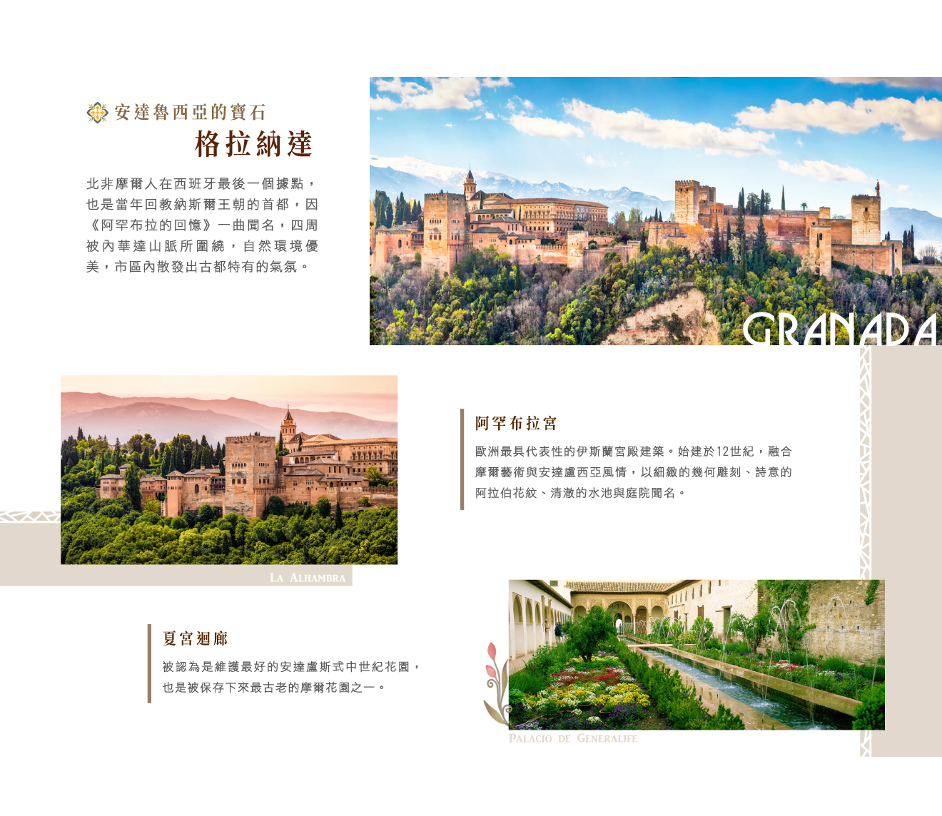 ■格拉納達,北非摩爾人在西班牙最後一個據點,也是當年回教納斯爾王朝的首都,因《阿罕布拉的回憶》一曲聞名,四周被內華達山脈所圍繞,自然環境優美,市區內處處還散發出古都特有的氣氛,不僅歷史遺跡多可以說是西班牙異族歷史變遷的舞台、頗具異國風味的小酒館、咖啡館及手工藝品,更是令人樂於造訪,由當地具執照專業導遊帶領下展開回教建築經典★阿罕布拉宮、查理五世宮殿之旅,始建於12世紀,至14世紀時擴建成今天的規模,入內參觀阿拉伯內宮建築妃妾寢宮、獅子廳水泉、大澡堂…★仙內拉麗妃花園及夏宮迴廊等。