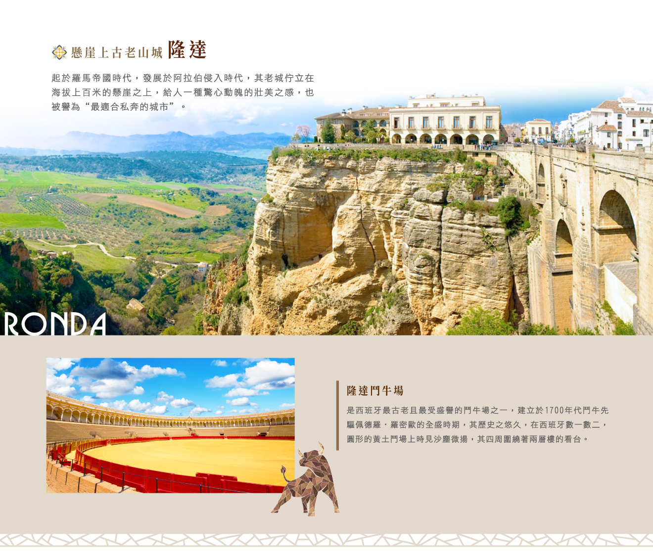 ■隆達懸崖山城,由當地具執照專業導遊帶領參訪古老的★鬥牛場及博物館,豔陽下的黃土襯映紅色的擋板,彷彿聽見了鬥牛急促的喘息與群眾的鼓譟,此地就是近年西班牙電影《卡門》的拍攝場地;隨後前往跨越深谷的壯麗新橋,漫遊古城區的石板路上,如腳力許可,推薦前往菲利普五世門,沿著古老城牆,欣賞遠方遼闊的景色及河谷對岸堆疊的白牆房舍,也可以沿著山坡小徑穿過摩爾人遺留的古城門前往河谷中親身感受新橋的壯麗與優美的環境。