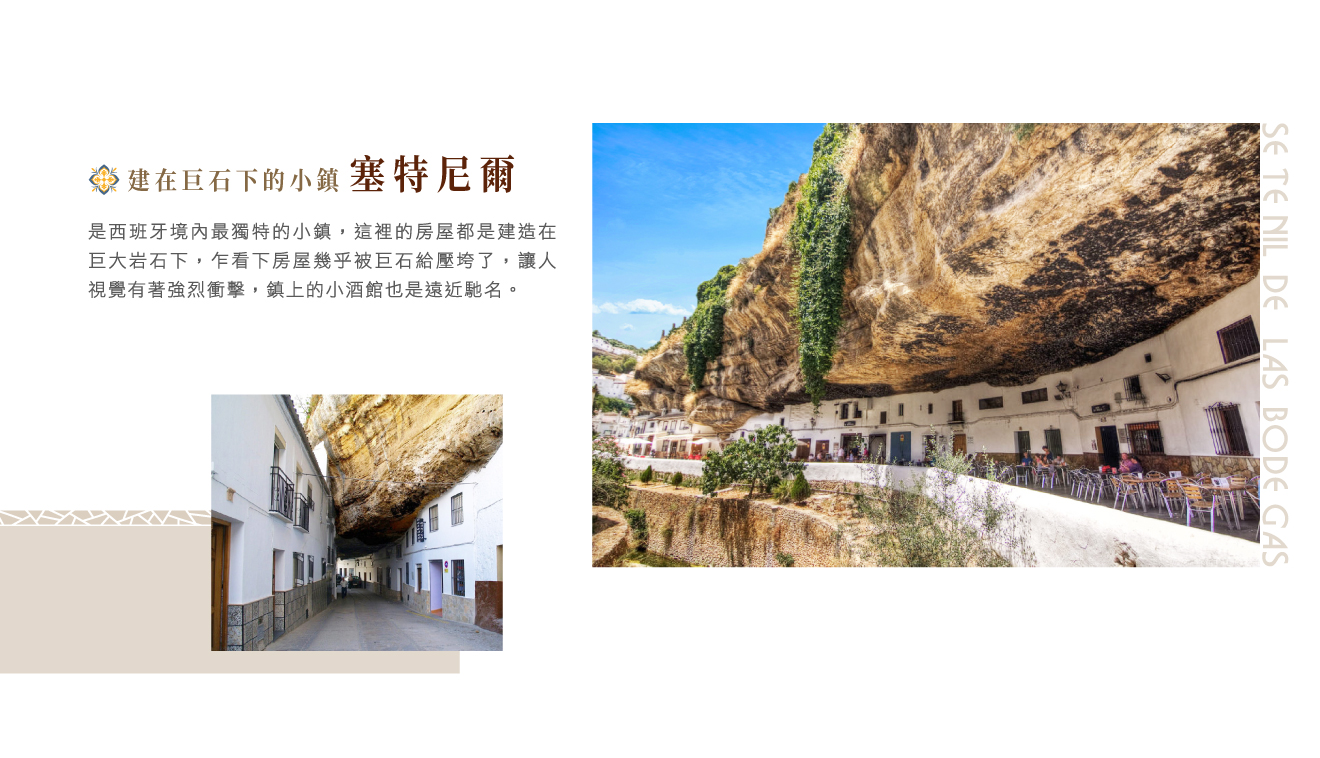 ■塞特尼爾,座落在傳統人文和歷史氣息濃厚的安達魯西亞地區,是西班牙境內最獨特的小鎮,這裏的房屋都是建造在巨大岩石下,乍看下房屋幾乎被巨石給壓垮了,讓人視覺有著強烈衝擊,居民住在巨石縫裡,彷彿回到原始人的生活,當地特殊的地形,人們依特雷荷河崖壁而居,據考古學家發現,二萬五千年前這附近就已經有人類足跡,岩石穴壁是良好的庇護所,還有堅硬不易摧毀的特性;小鎮名字來源於12世紀基督徒為奪回被伊斯蘭摩爾人佔據的這座村莊,進攻了7次仍然失敗,因應這7次失敗(Septem-Nihil)羅馬拉丁短語的諧音演變而成;現今居民們以種植、加工橄欖為生,近年來,巨石小鎮名號打開,旅遊觀念業也成了經濟收入的主要來源,鎮上的小酒館及餐館也是遠近馳名。