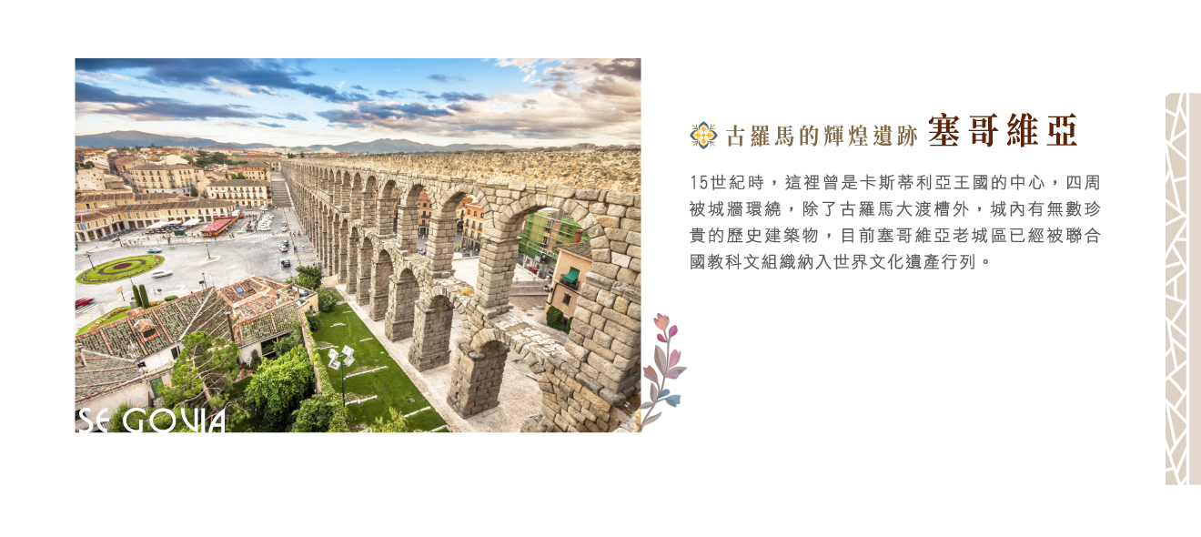 羅馬人建立之古城■塞哥維亞,徒步大道上矗立兩千年前用石塊堆疊而成的水道橋,最令人驚嘆羅馬人都市規劃觀念及高度的工程技術、沿著國王之路進入古城,地區獨有的灰泥雕飾牆面、防禦性的豪宅宮廷、有金色貴婦美名的大教堂……皆值探訪。