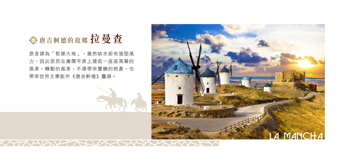 搭乘高速火車前往拉曼查皇城■拉曼查地區,■唐吉軻德之路,依稀浮現了著名的傳記英雄、看不慣世間不平之事、為伸張正義而四處「打拼」的遊俠騎士唐吉軻德,其心懷偉大夢想馳騁天下的事蹟,至今仍為人津津樂道,我們一同探索其雲遊四方的足跡,誤視客棧為城堡、錯把風車當巨人,我們一一帶您前往唐吉軻德下榻、受封為騎士的■客棧,對他來說可是豪華城堡呢!以及坐落許多白色巨人的■風車嶺,在這邊更可瞭望拉曼查平原上的鄉村景觀。
