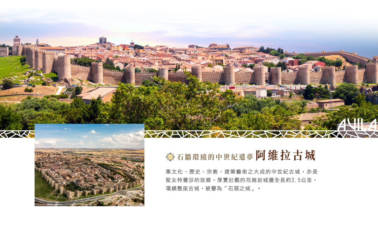 列名世界遺產的■阿維拉古城,集文化、歷史、宗教、建築藝術之大成的中世紀古城,亦是聖女特蕾莎的故鄉,四週環繞著約2.5公里長11~12世紀因防禦回教徒所建的壯闊城牆,88座高塔與9扇城門依然保存相當完整,位在標高1130公尺山上,涼爽的氣候吸引了眾多遊客,可輕鬆悠遊古城裏、或登高城塞遠眺,城裏店家所販售的蛋黃甜點Yemas,不妨品嚐一下!隨後前往城郊的四柱亭可以拍得最佳的古城全景。