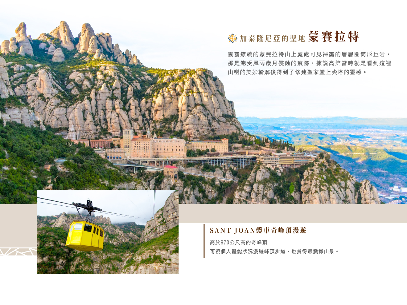 ■蒙賽拉特修道院,位於奇峰秀谷中的天空之城於山腳攝取全景,高1263公尺的蒙賽拉特山,雖非是遊客熟知的名山竣嶺,但確是一處結合自然奇景與宗教信仰的心靈聖地,在平原中矗然而起的火山凝灰岩,氣勢磅礡形狀相當奇特,彷彿被鋸子鋸得渾然天成,◆搭乘登山電車或高空纜車(需視營運時間及氣候安全條件而安排),依附壯麗山勢而行,居高點欣賞整體環山全景,漫遊欣賞其層疊、錯落的奇峰及山洞中的修道院大教堂、中庭廣場等,置身於修士們隱身千年的清幽,並至修道院教堂內向黑色聖母祈求平安好運來;隨後特別安排◆SANT JOAN纜車再升高970公尺高的奇峰頂,可視個人體能狀況漫遊峰頂步道,也賞得最震撼山景。