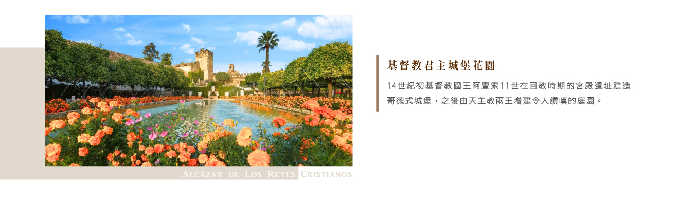 ★基督教君主城堡花園,14世紀初基督教國王阿豐索11世在回教時期的宮殿遺址建造哥德式城堡,之後由天主教兩王增建令人讚嘆的庭園,也是航海英雄哥倫布會見兩王的歷史場所。