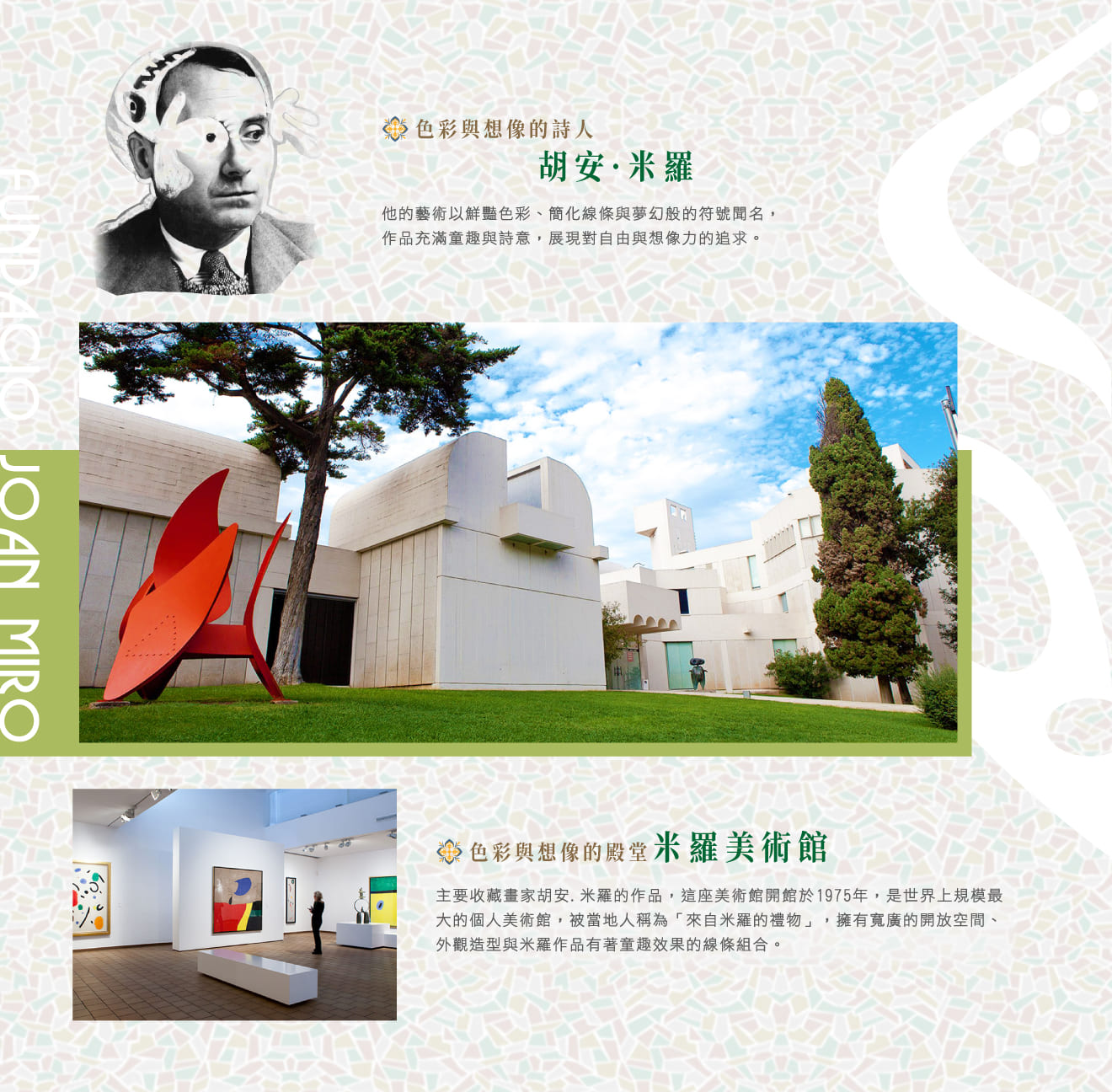 ★米羅美術館(Fundacio Joan Miro),位於巴塞隆納蒙朱伊克山,主要收藏畫家胡安.米羅的作品,這座美術館開館於1975年,是世界上規模最大的個人美術館,被當地人稱為「來自米羅的禮物」,擁有寬廣的開放空間、外觀造型與米羅作品有著童趣效果的線條組合,獨特的屋頂造型,令人聯想到德國柏林包浩斯(Bauhaus) 博物館,米羅的作品充滿童趣的異想,自幼就對於大自然的風景非常熱愛,畫作常以自創類似天文符號及色塊構成,總有一種天真、無邪、童趣風格成為的個人風格,與畢卡索、達利並列西班牙近代三大藝術家。
