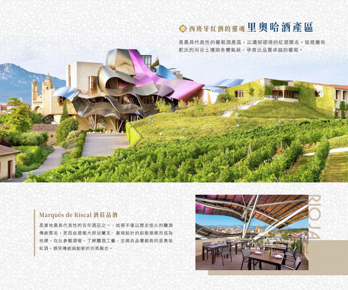 企劃語錄: Marqués de Riscal酒莊品酒如遇休館、包場或訂滿,未免影響行程順暢度將以官方推薦之酒莊替代。