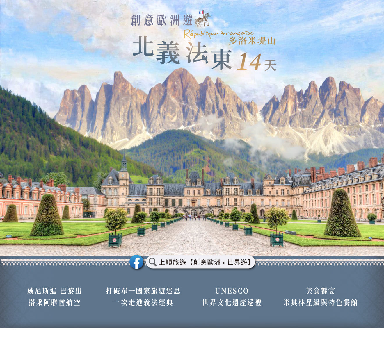 創意北義法東~多洛米堤山瑪基歐里湖勃艮地香檳二大酒鄉子爵宮楓丹白露14天