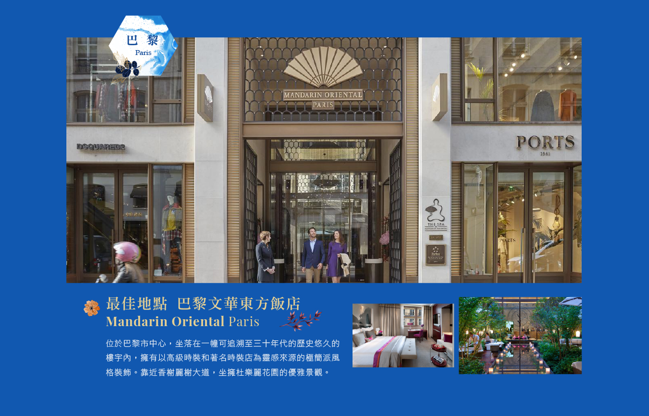 早餐:旅館內或餐盒 午餐:配合購物逛街、敬請自理 晚餐:特別安排塞納河遊船或和平咖啡館法式料理晚宴佐產區葡萄酒