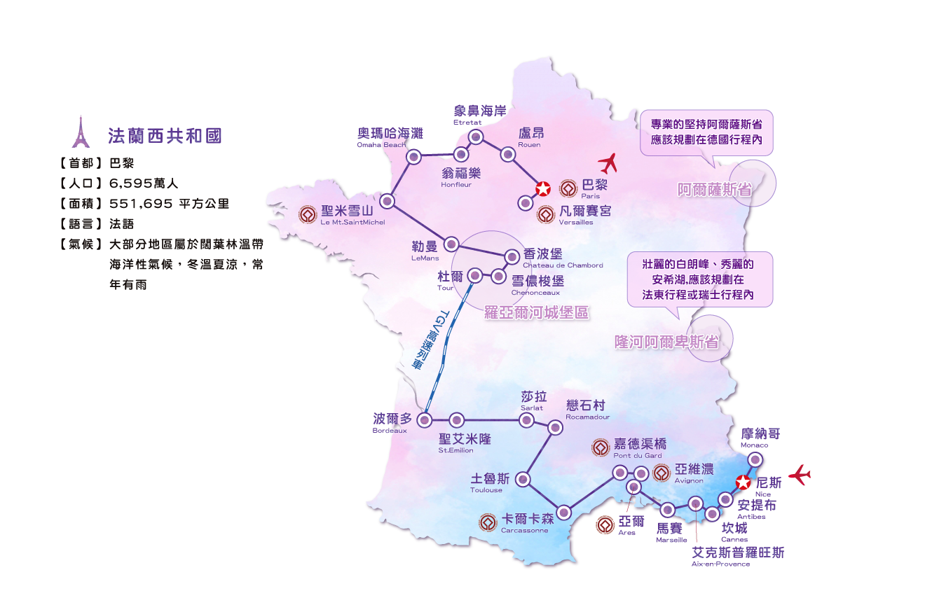 2026/11/07(六) | 桃園國際機場出發 創意法國~蔚藍海岸普羅旺斯波爾多聖米雪山諾曼地登陸象鼻海岸古堡酒鄉16天機位 29 候補0 已售0 可售28阿聯酋航空EK南進北出單一路線、晚班機回豪華團 |