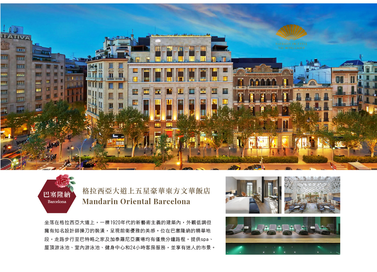 住宿:Mandarin Oriental Barcelona 或 巴塞隆納 Monument Hotel 或 ME Barcelona 或 Almanac Barcelona 或同等級