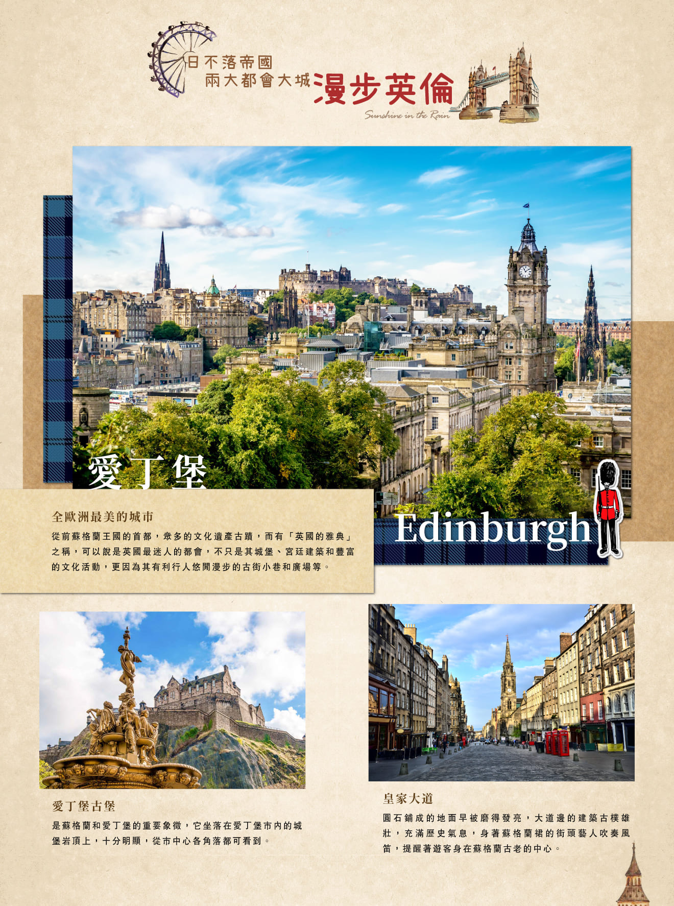 愛丁堡這一座融合中世紀風情與大都會特質的城市,相當迷人值得慢慢探索,以皇家大道為中心往四周閒逛,探訪無數歷史建築群或漫步隔鄰典雅的王子大街,露天廣場、百貨公司、蘇格蘭格子呢料及毛衣均值選購,藉由自由輕鬆探訪,重新發現和享受蘇格蘭式的豪爽和熱鬧。