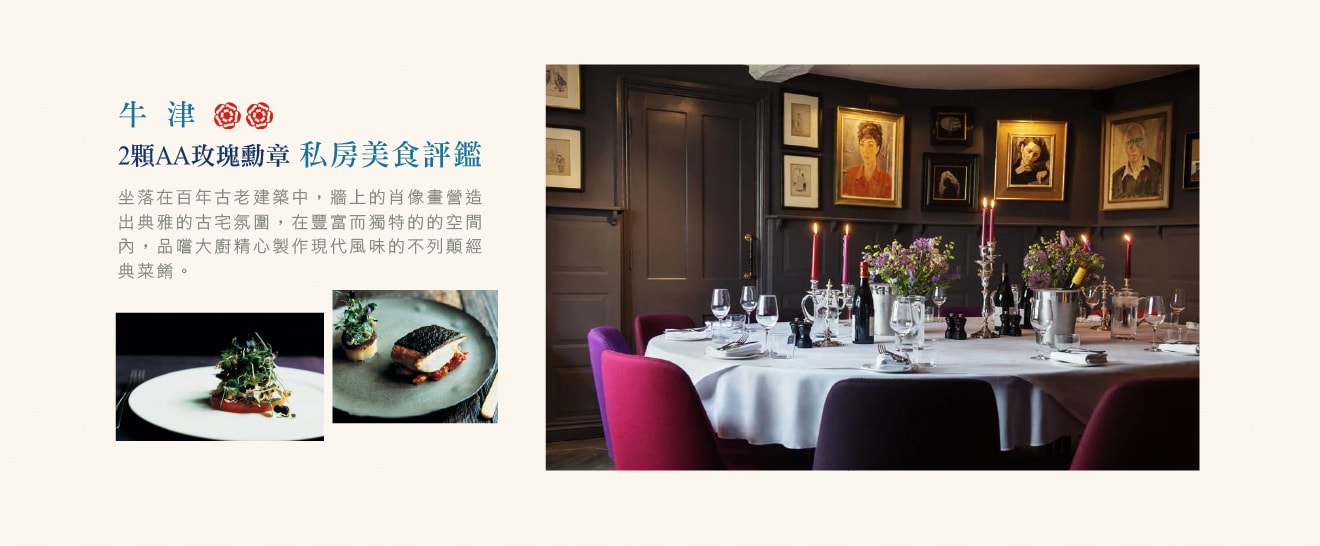 午餐:特別安排3顆AA玫瑰勳章頂級莊園午宴,主廚推薦科茨沃茲料理