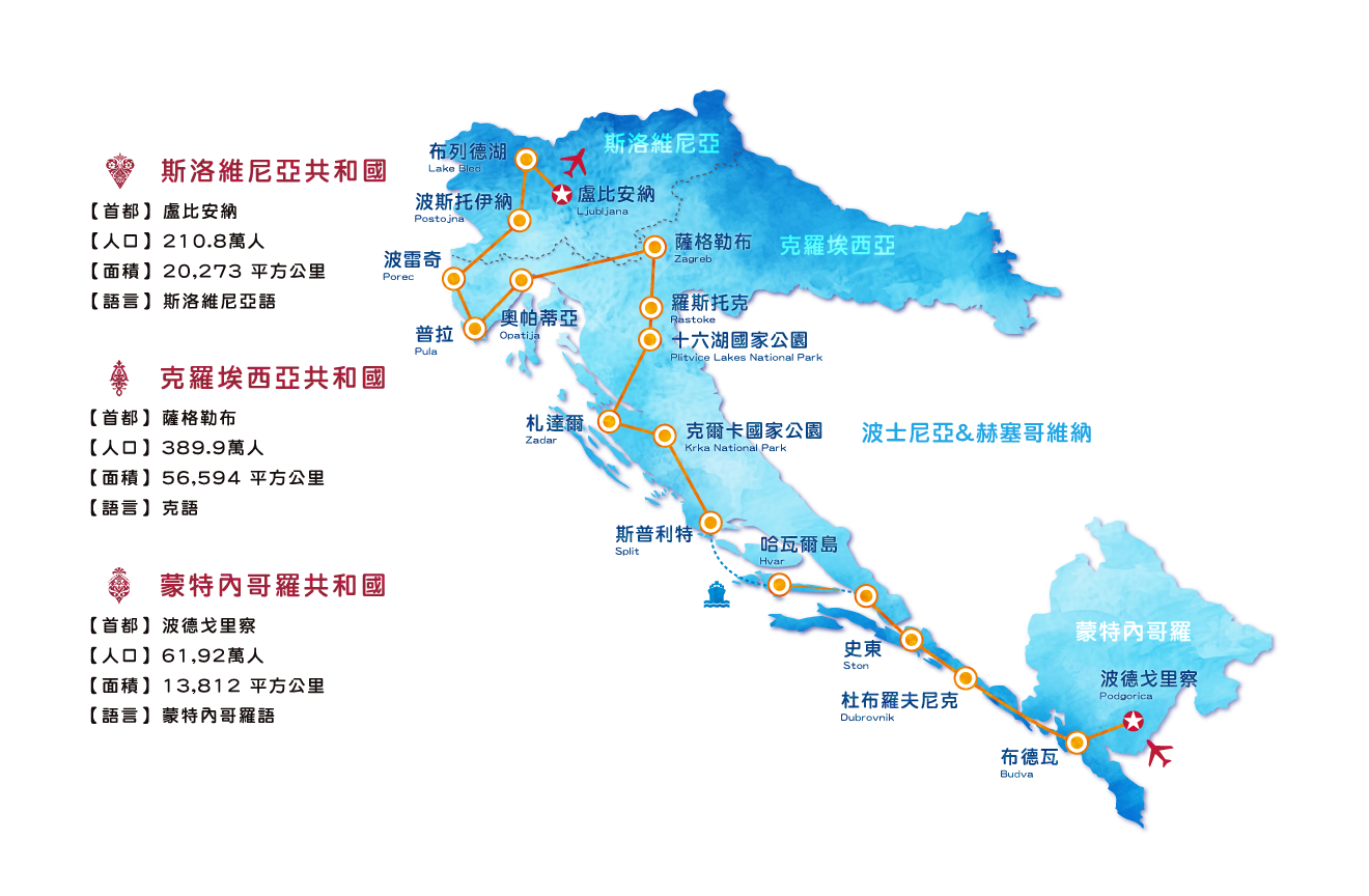 2026/05/25(一) | 桃園國際機場出發 創意克羅埃西亞.斯洛維尼亞.蒙特內哥羅 伊斯特里亞半島十六湖國家公園哈瓦爾跳島科托峽灣藍洞經典13天機位 29 候補0 已售0 可售28土耳其航空TK南進北出.當晚抵達入住旅館豪華團 |