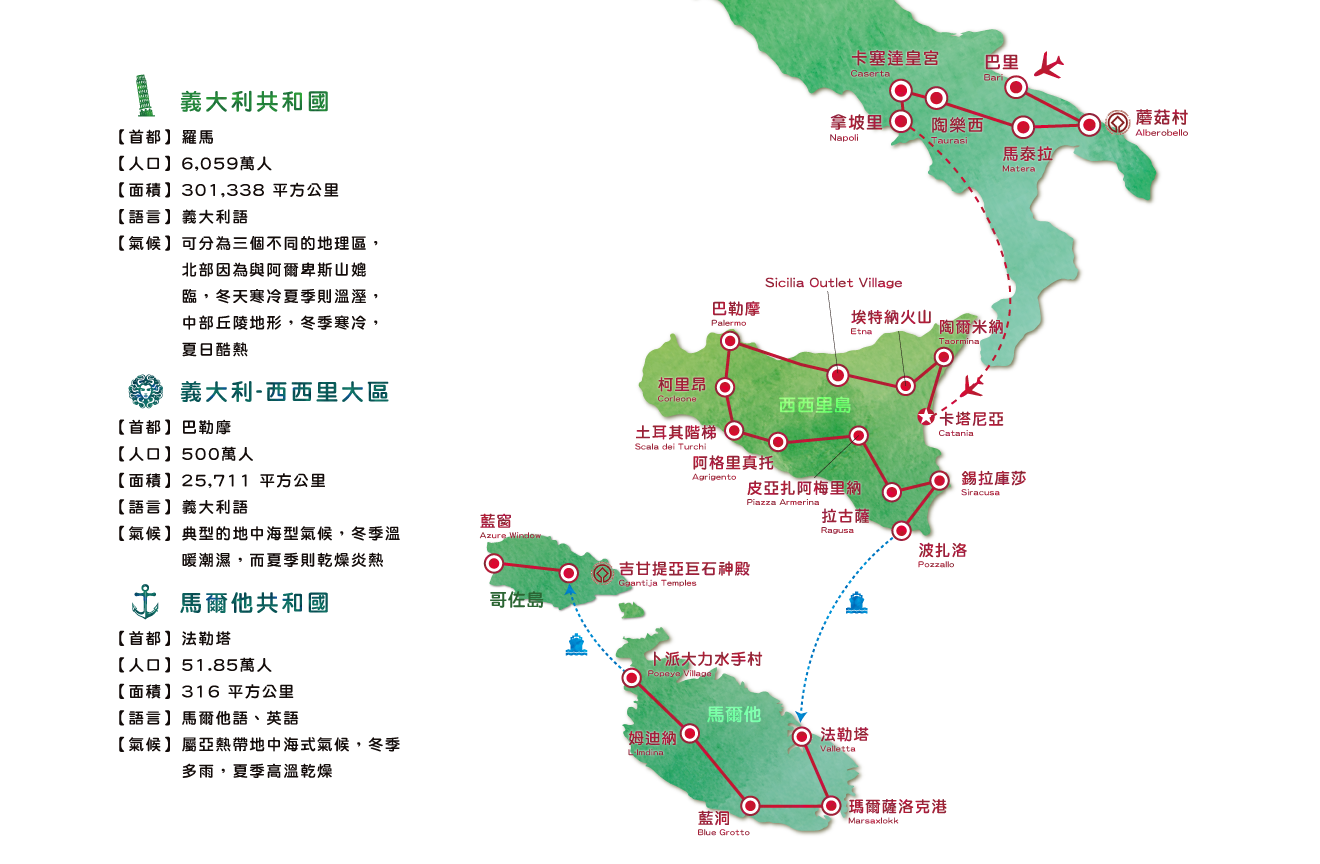 2026/04/26(日) | 桃園國際機場出發 創意南義+西西里島+馬爾他蘑菇村馬泰拉石窟卡塞達皇宮埃特納火山神殿之谷瑪蓮娜美麗傳說15天機位 29 候補0 已售0 可售28土耳其航空TK巴勒摩2晚.法勒塔3晚版 |