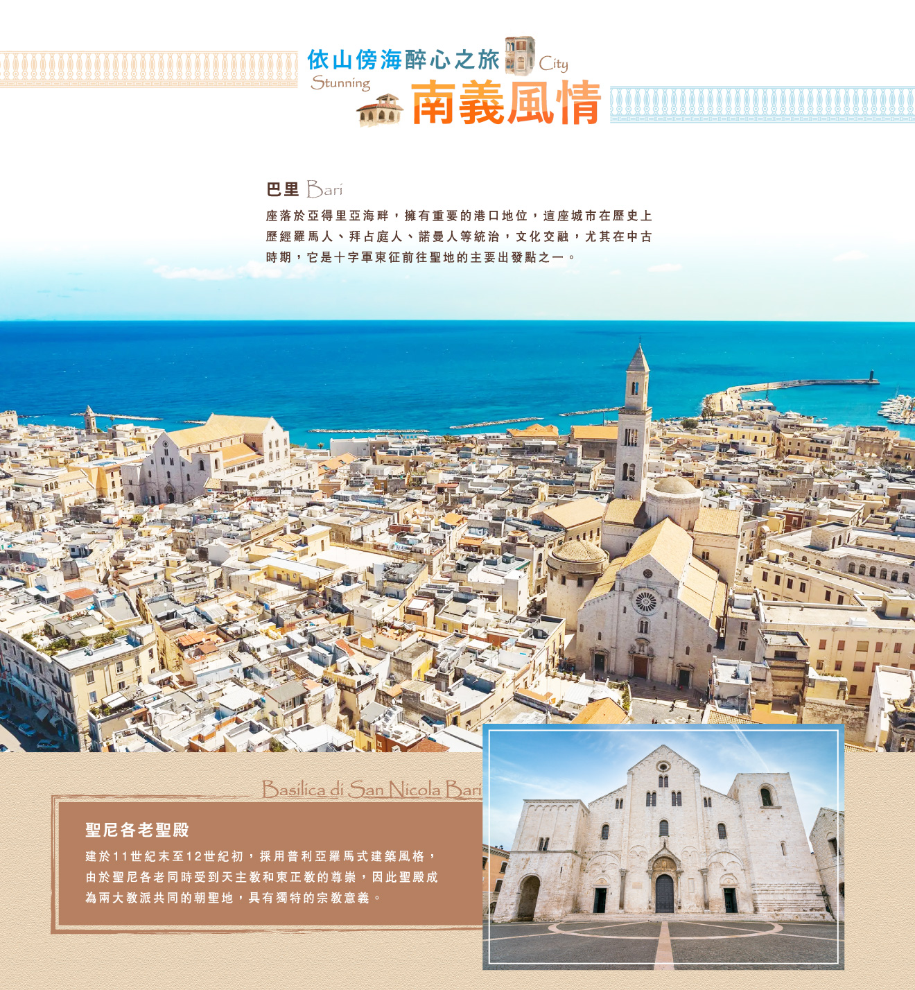 ■巴里,是普利亞大區的中心城市,座落於亞得里亞海畔,擁有重要的港口地位,這座城市在歷史上歷經羅馬人、拜占庭人、諾曼人等統治,文化交融,尤其在中古時期,它是十字軍東征前往聖地的主要出發點之一。