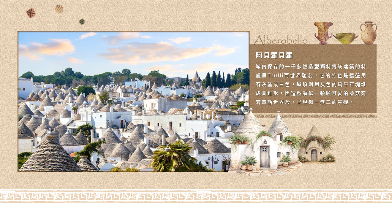 ■阿貝羅貝羅,是義大利普利亞大區巴里省的一個小城,有人口約一萬一千人,城內保存的一千多幢造型獨特傳統建築的特盧里Trulli而世界馳名,它的特色是牆壁用石灰塗成白色,屋頂則用灰色的扁平石塊堆成圓錐形,因造型頗似一顆顆可愛的蘑菇宛若童話世界般,呈現獨一無二的景觀,18世紀末期據說特盧里是當地人為了逃稅而造,收稅時就把屋頂拆掉,表示這裡沒有人居住,曾一度因老舊不符合現代居住而面臨被毀滅的危機,在1996年名列聯合國教科文組織世界遺產,也在屋頂整修增加方便識別的文字和圖騰,現今的特盧里已大部分改建為紀念品店、餐館、酒吧咖啡館及旅館。