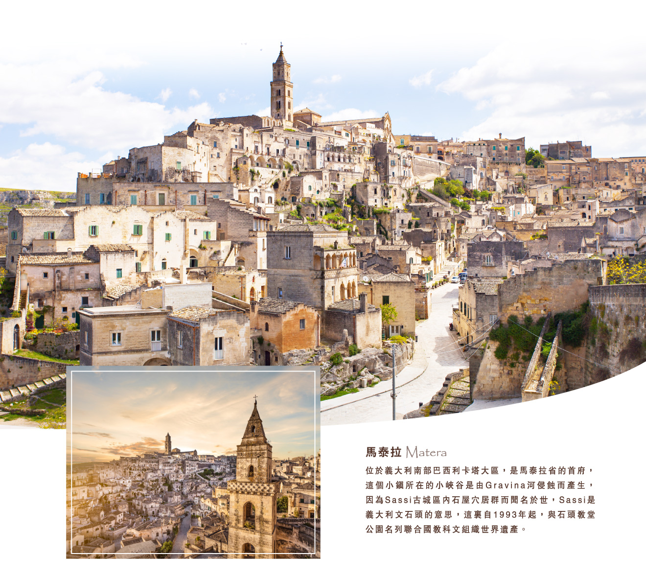 ■馬泰拉,位於義大利南部巴西利卡塔大區,是馬泰拉省的首府,這個小鎮所在的小峽谷是由Gravina河侵蝕而產生,因為Sassi古城區內石屋穴居群而聞名於世,Sassi 是義大利文石頭的意思,這裏自1993年起,與石頭教堂公園名列聯合國教科文組織世界遺產;到現在都還有居民生活在傳統的石窟裡,整個古城區保存的相當完善,狀似兩千多年前的聖地耶路撒冷,許多電影都選擇在此拍攝,其中最有名的便是 "受難記";依Gravina河而區分為南北二區,古城區傳統屋舍教堂廣場錯落有致的分佈期間,漫步其中頗有奇特迷情之感。