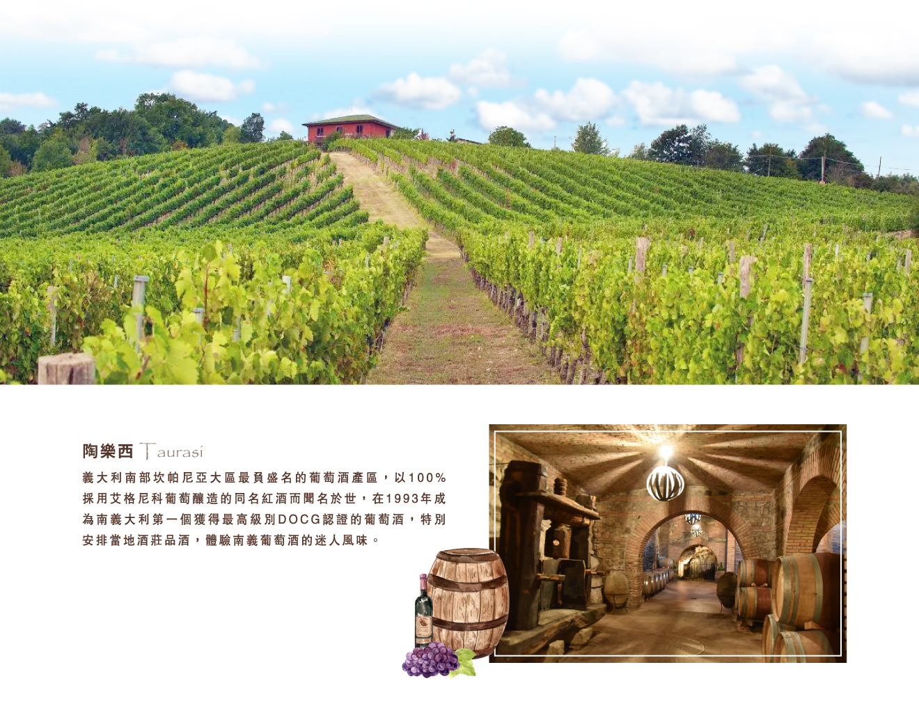 ■陶樂西(Taurasi),義大利南部坎帕尼亞大區最負盛名的葡萄酒產區,坐落於伊爾皮尼亞的丘陵地帶,以100%採用艾格尼科(Aglianico)葡萄釀造的同名紅酒而聞名於世,在1993年成為南義大利第一個獲得最高級別DOCG認證的葡萄酒,是當地風土和古老釀酒傳統的象徵。★特別安排當地酒莊品酒,體驗南義葡萄酒的迷人風味。