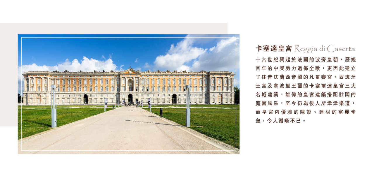 ★卡塞達皇宮,十六世紀興起於法國的波旁皇朝,歷經百年的中興勢力遍佈全歐,更因此建立了往昔法蘭西帝國的凡爾賽宮、西班牙王宮及拿波里王國的卡塞爾達皇宮三大名城建築,雄偉的皇宮建築搭配壯闊的庭園風采,至今仍為後人所津津樂道,而皇宮內優雅的陳設、建材的富麗堂皇,令人讚嘆不已。