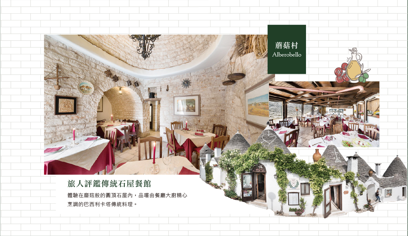 午餐:特別安排傳統石屋餐館或特色人文餐館巴西利卡塔傳統料理