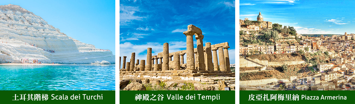 ★神殿之谷,古希臘詩人品達爾(Pindaros)曾盛讚這裡是「人間最美麗的城市」,也是現代劇作家皮蘭德婁(Luigi Pirandello)的出生地;神殿位處一座山丘上,地勢險要,一面可遠眺阿格里真托市區,一面可觀山谷綠地,神殿遺跡高大、氣勢非凡,雖遭受天災、戰火及早期基督徒的破壞,但至今仍保存相當完整,成為希臘境外最大、保存最好的多立克柱式神廟群。